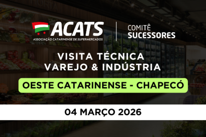 A Associação Catarinense de Supermercados (Acats) realiza, no dia 4 de março, uma visita técnica ao varejo e à indústria do Oeste catarinense, com atividades em Chapecó. Organizada pelo Comitê Sucessores, a ação tem como objetivo aproximar os participantes de operações de referência da região, com foco na troca de experiências entre empresários e gestores do setor.