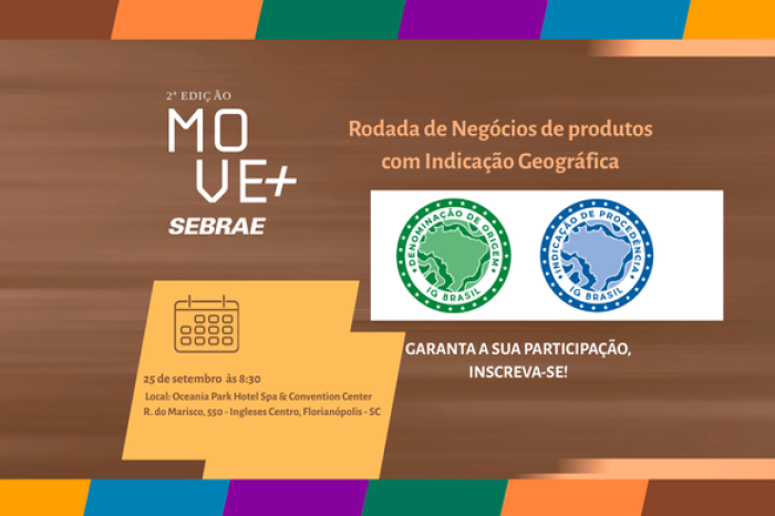 No dia 25 de setembro, o Sebrae promove a 2ª edição do MOVE+ , um encontro voltado à conexão de ideias, fortalecimento de negócios e impulsionamento de vendas, com foco em rodadas de negócios de produtos com Indicação Geográfica (IG). O evento será realizado no Oceania Park Hotel Spa & Convention Center, na Praia dos Ingleses em Florianópolis, e irá reunir produtores e empreendedores em uma programação que combina negócios, palestras, painéis e exposição de produtos.